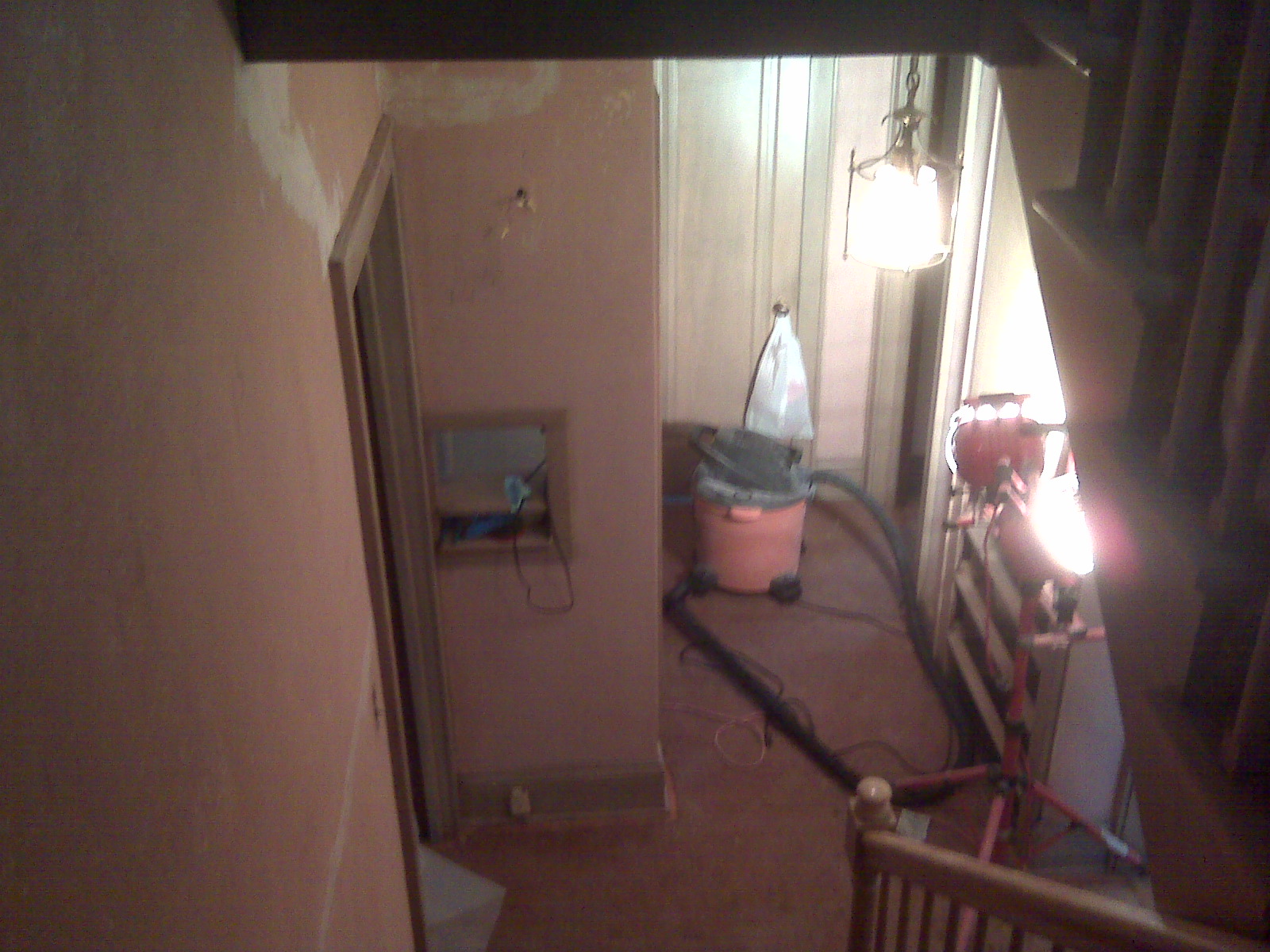 But first, to give you a look at "end result" of NO WALLPAPER in the hallways, stairwell, and full bath. And yes, much of the plaster underneath the wallpaper is PINK! Good thing we're painting!